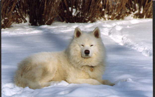 an old photo of our very first Samoyed, Teddy, also enjoying laying in the snow.