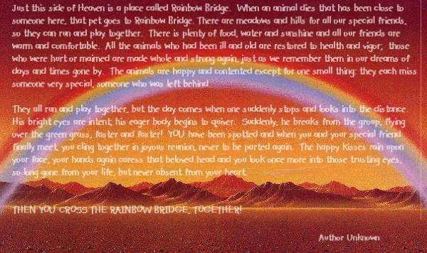 In April of 1999 he turned 15. He suffered from Canine Cognitive dysfunction (doggie Alzheimer's) and Arthritis and unfortunately and tearfully for all of us, went to The Rainbow Bridge. He could no longer support himself as the muscle tone in the rear was gone. Wednesday, Dec. 29, 1999.